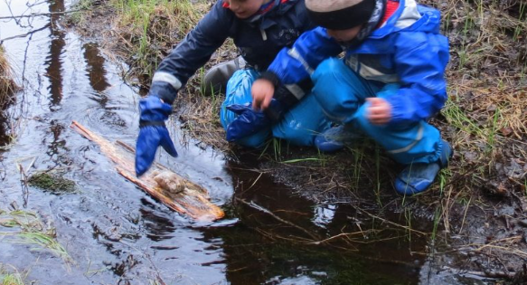 Barna kan prøve å bygge små «bekkebåter» av kvister og mose for enda mer utfordring.